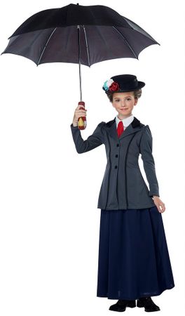 Mind your manners and always be polite. The English Nanny child costume includes a gray button down jacket with black trim, white dickey shirt front, red necktie, navy skirt with elastic waist, black hat, three fabric flowers and a red Parrot shaped umbrella handle cover. Shoes and umbrella are not included. Our custom sizing chart for this costume can help you decide on a girl's medium, large or x-large.