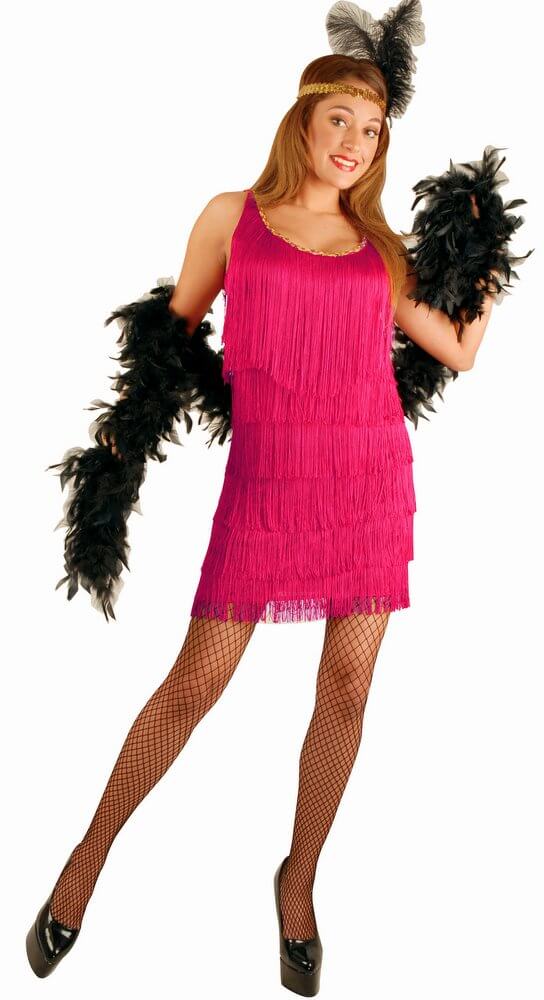 Dance the Charleston all night long just like a socialite from the Roaring '20s in this fun, frisky Fuchsia Flapper Costume. The bright fuchsia hue matches your outgoing personality, while the rows of dangling fringe create lots of movement as you dance or mingle at a party. Gold sequin trim accents the scoop neckline, and this fancy frock looks even better when paired with fishnet stockings or a feather headband from our other