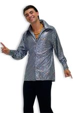 Play Mr. Disco at that '70s costume party wearing this shimmery silver Saturday Night disco shirt from Candy Apple Costumes. Our fancy button-front shirt is dressed up with tuxedo ruffles. Pair it with our men's bell bottom disco pants. Choose yours in a men's small, medium or large. Our custom sizing chart shows exact shirt measurements.