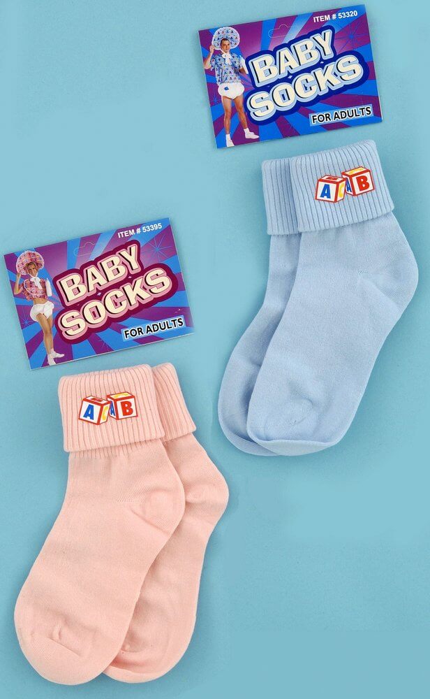 Complete your adult baby costume with these adult size baby socks in pink or blue with building blocks screen print. One size fits most adults.