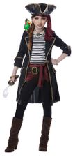 Let your child sail the high seas of her imagination in this girls' pirate costume! Includes brown faux leather lace-up vest, red head scarf, white peasant blouse, and layered skirt. Sword and boots not included. By Forum.