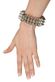 The Adult Small Silver Spike Bracelet is made of silver-tone plastic and has three rows of 5/8 inch spikes that wrap around the wrist. The spikes are on a stretchy elastic band for an adjustable fit.