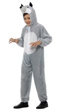 You'll be ready to howl at the moon on Halloween in this adult wolf costume! Includes a comfy gray polar fleece jumpsuit with attached faux fur tail, wolf face and ears on the hood, snap front closure, and two pockets. One size fits most adults up to size 2X; measures 58 inches long from shoulder to ankle and 58 inches in the chest. Great for men or women! By RG.