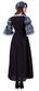 Ankle-length black dress with silver and black patterned inset on the bodice, skirt and sleeves, white lace trim at the square neckline and sleeves, zip closure in back. Includes silver and black patterned bonnet with black satin ribbon ties and elasticized back.