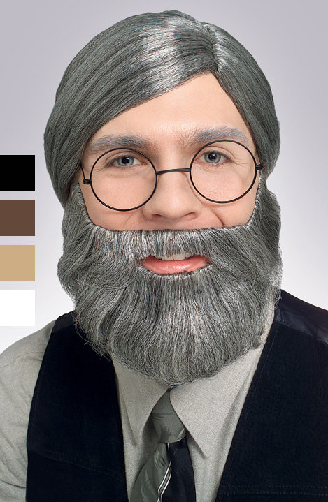 Deluxe adult size neat and tidy beard with mustache. Has elastic to go over the head. Fine synthetic fiber sewn to a net foundation. Comes in black, brown, grey, white, or blonde. One size fits most adults and kids 12 and up. Wig and glasses not included. By Rubies.