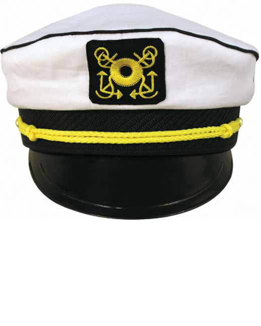 Be the captain of your own vessel in this white sailor hat in a fancy yacht captain style. White fabric hat with black brim, black and yellow embroidered patch, and yellow braid trim. One size fits most. Perfect for a sailor costume or the Skipper from Gilligan's Island!